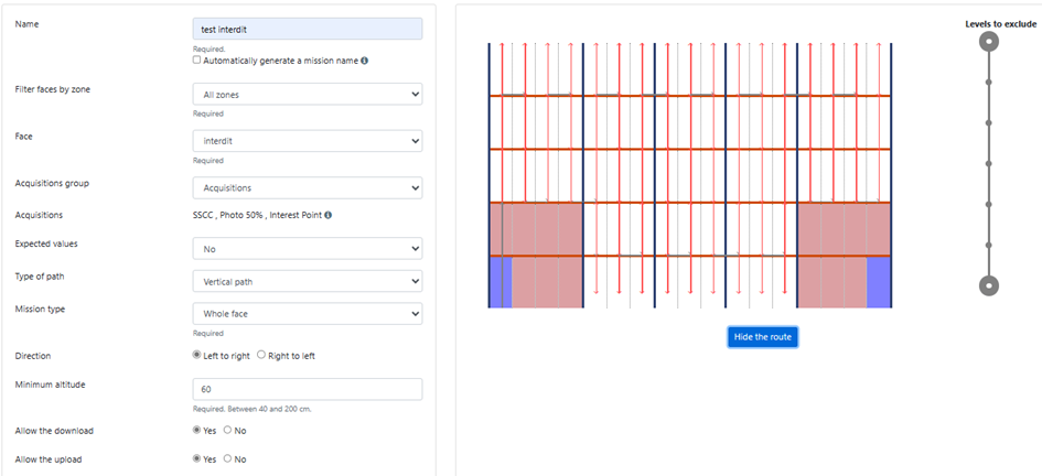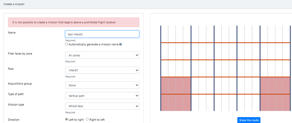 Then, by clicking on the ‘Draw route’ button, check that the flight plan includes all the slots to be surveyed. If this is not the case, change the mission type.