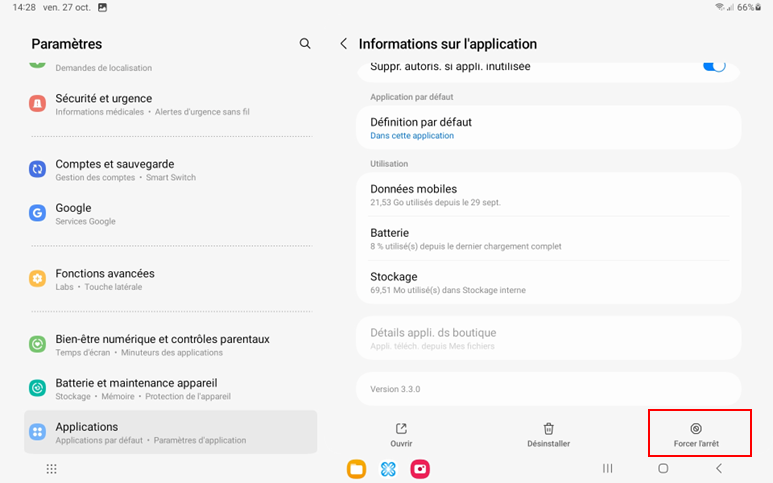 Une nouvelle fenêtre s'ouvre dans l'application Paramètres. Cliquer sur l'option Forcer l’arrêt.