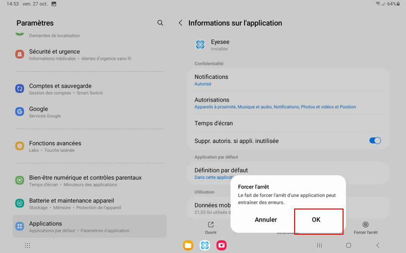 EYESEE App dysfonctionne : faire un arrêt forcé