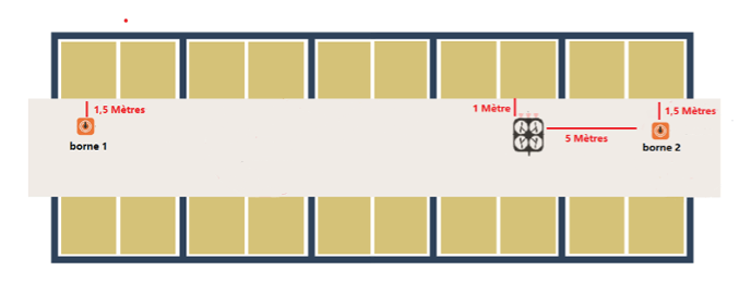 Si la configuration ne peut pas respecter un écart de sécurité de 3.5 mètres entre le EYESEE Tag et EYESEE Drone pour le décollage et l’atterrissage, une autre configuration de mise en place est possible : le drone vole en dehors des 2 EYESEE Tag.