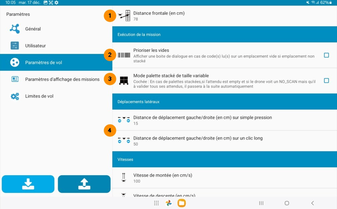 Permet de paramétrer en CM les pas de déplacements latéraux sur un clic long (comme pour le clic du décollage). Ce mouvement permet de décaler le drone d’une plus grande distance lorsque la palette est d’une grande largeur et s’étend sur plusieurs emplacements.