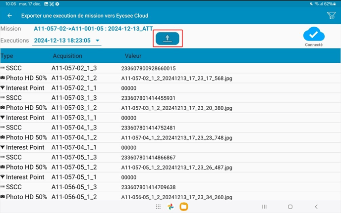 Une fois la mission exécutée, cliquez sur ce bouton pour remonter la mission sur EYESEE Cloud si la mission a été exécutée intégralement ou si l'option Visibilité du bouton Export a été cochée dans le menu Paramètres > Paramètres d'affichage des missions