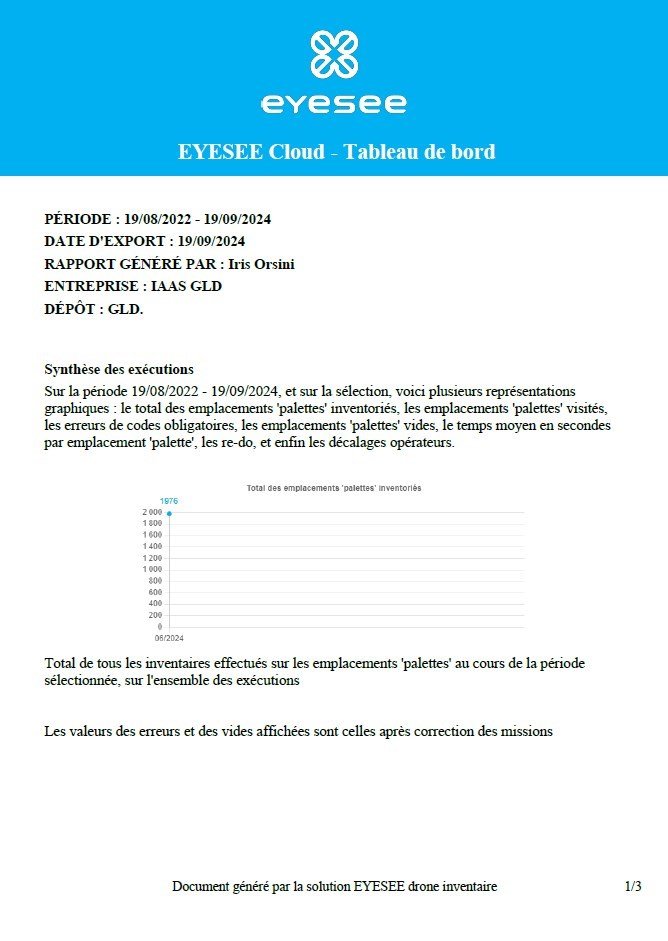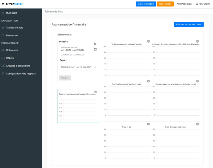 Le tableau de bord permet de suivre l’inventaire et les différents éléments tels que les erreurs, les emplacements vides, le temps moyen par emplacement, les nombres de redo / mouvements opérateurs. Il est possible d’afficher ces valeurs sur une sélection d'un ou plusieurs dépôts / zones / faces, pour une période choisie.