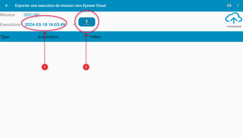 Nota bene: poiché ogni missione può essere eseguita più volte, possono esserci diverse acquisizioni per ogni missione. Pertanto, quando si desidera caricare i risultati di una missione su EYESEE Cloud, assicurarsi di selezionare l'acquisizione desiderata nel menu a discesa “Esecuzioni”.