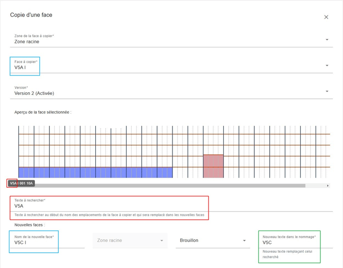 — Encadré rouge : nom de la face présent dans le nom d’emplacement, à remplacer par le nom de la nouvelle face dans l’encadré vert.