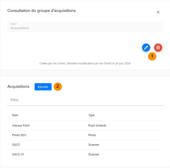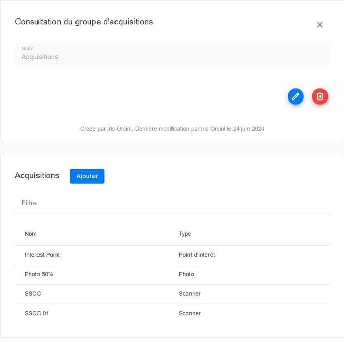 - Modifier ou supprimer un groupe d’acquisitions : cliquez sur l’icône correspondante puis validez.