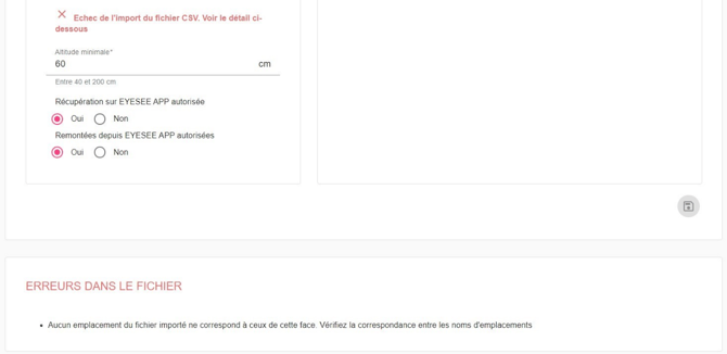 Si l’import du fichier échoue, ce message apparaîtra, et la ou les erreurs seront affichées plus bas :