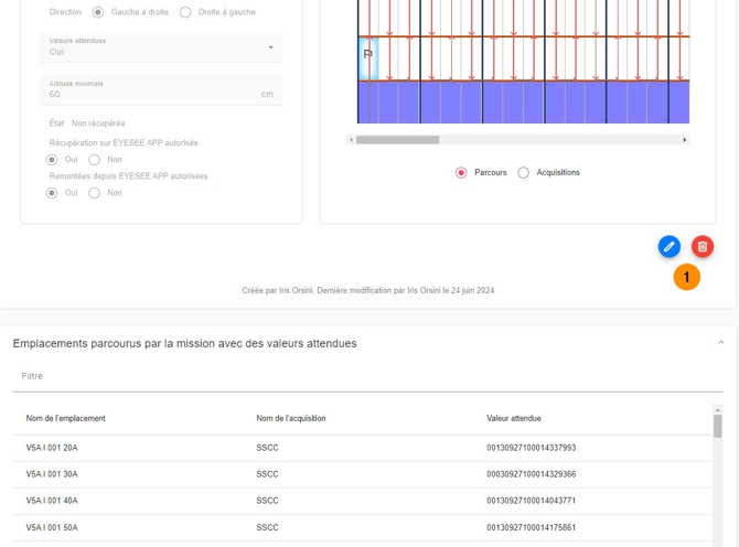 [1] Modifier ou supprimer une mission : cliquez sur l’icône correspondante puis validez.Il est possible de modifier une mission tant qu'elle n'a pas été récupérée sur EYESEE APP.