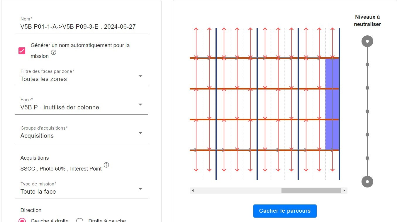 Ensuite, en cliquant sur le bouton « Dessiner le parcours », vérifiez que le plan de vol prend bien en compte la totalité des emplacements à inventorier. Si ce n’est pas le cas, modifiez le type de mission.