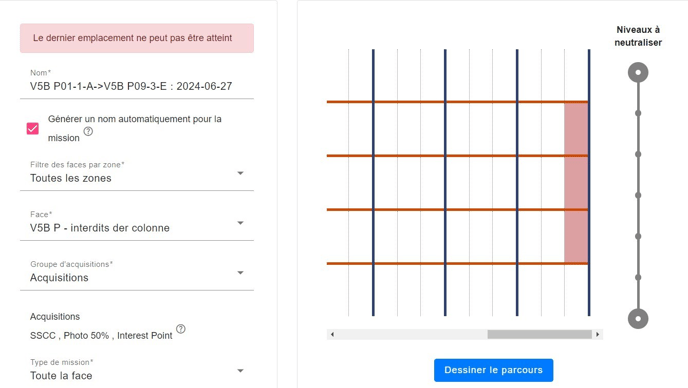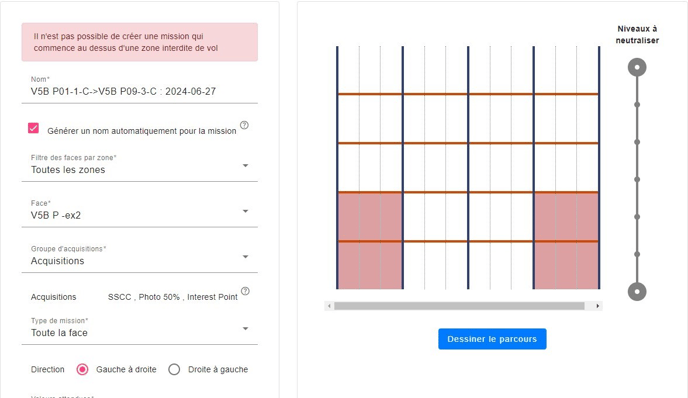 Avec une contrainte de vol « Interdit de vol » et selon le type de mission sélectionné, il ne sera pas possible d’enregistrer la mission. Exemple ici avec un type de mission “Toute la face” (même cas pour le type “Entre deux colonnes”) :