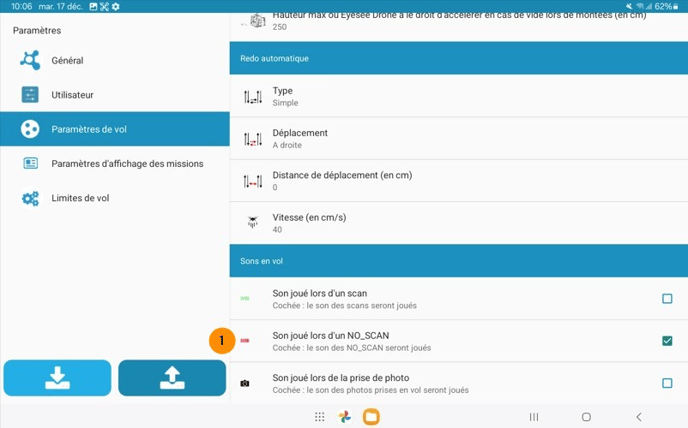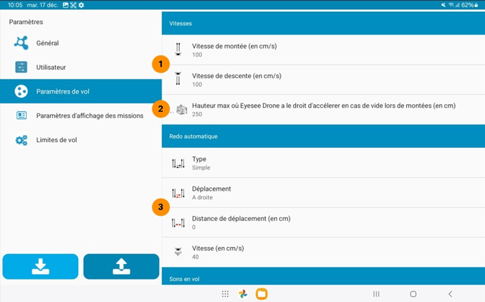- Vitesse de montée : Permet de régler la vitesse du drone en montée (en cm/sec).