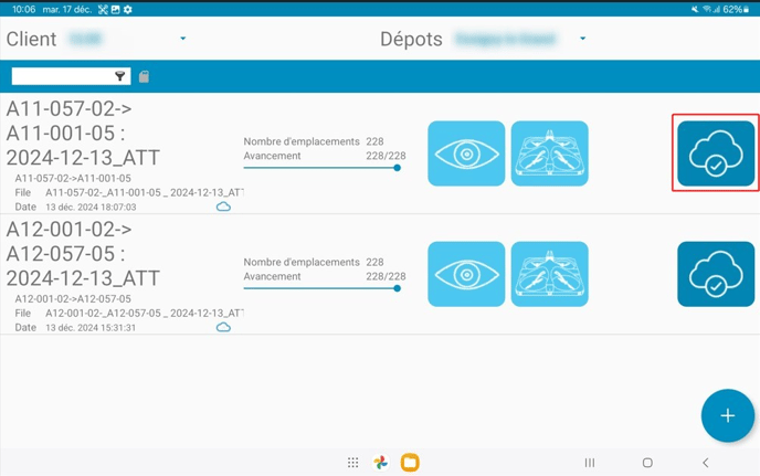 Une fois la mission exécutée, cliquez sur ce bouton pour remonter la mission sur EYESEE Cloud si la mission a été exécutée intégralement ou si l'option Visibilité du bouton Export a été cochée dans le menu Paramètres > Paramètres d'affichage des missions