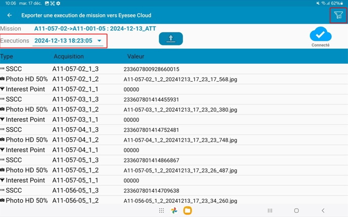 Attention : chaque mission pouvant être exécutée plusieurs fois, à chaque mission peuvent correspondre plusieurs acquisitions. Ainsi, lorsque vous souhaitez remonter les résultats d'une mission sur EYESEE Cloud, veillez à bien sélectionner l'acquisition souhaitée dans le menu déroulant "Exécutions".