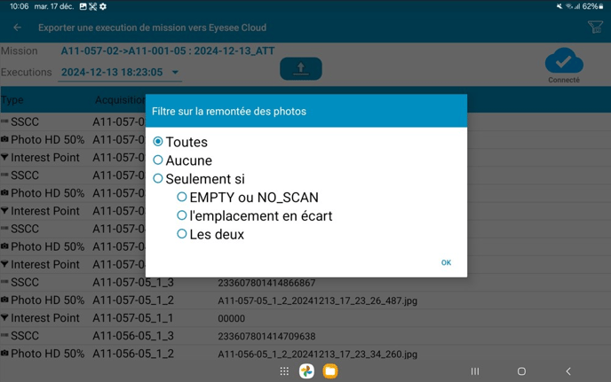 En cliquant sur l'icône en haut à droite de l'écran, vous pouvez filtrer les photos qui seront remontées avec la mission. Cet écran s'affiche, vous permettant de choisir quelles photos vous souhaitez remonter sur EYESEE Cloud :