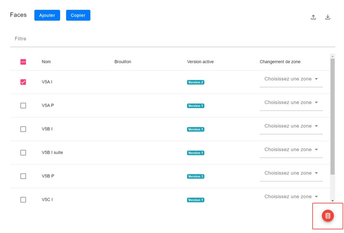 Dans la liste des faces, cliquez sur la face dont vous souhaitez supprimer une version.
