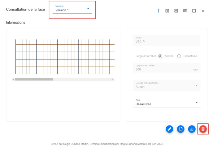 La suppression d’une version d’une face (quel que soit le nombre de versions) est possible seulement s’il n’y a pas de mission créée sur la version.