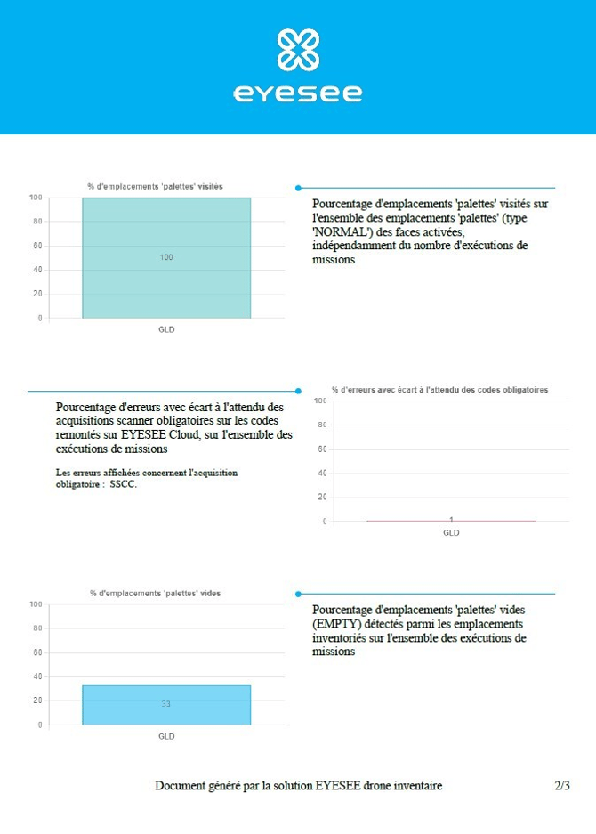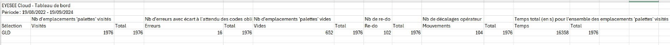 Les 2 autres pages contiennent les graphiques des emplacements ‘palettes’ inventoriés, les emplacements ‘palettes’ visités, les erreurs de codes obligatoires, les emplacements ‘palettes’ vides, le temps moyen en secondes par emplacement ‘palette’, les re-dos, et les décalages opérateurs.